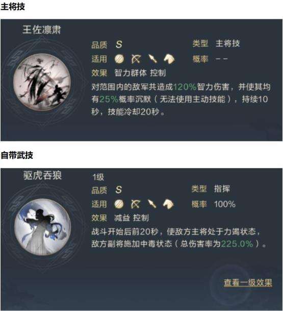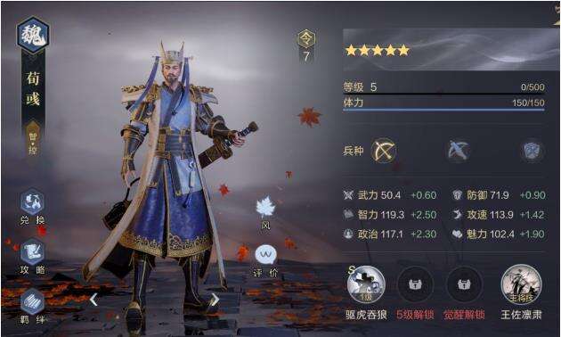 对武术有双重控制,无论是“王佐凛肃”的效果(无法使用主动技能,无法克制智性武将),还是虎狼强加的“疲惫状态”,都可以大大降低战损。两种武术伤害都很高。此外,荀彧2.5的智力增长、卓绝的控制力和输出都不弱。荀彧是当前版本中最适合土地开荒的武将之一。