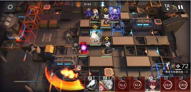 现在你需要两个奶盾和两个攻击范围是中指的守卫(下面最好的是银灰)。一定要像这样分开放,不然会因为boss技能猝死。