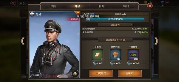 乘员升级:乘员初始等级为1级,最高等级30级,且乘员当前等级不可高于玩家当前等级。可以通过派遣搭载该乘员的坦克战斗,在结算界面获得乘员经验;也可以用消耗道具干面包、意大利面、牛排套餐等快速获取乘员经验。