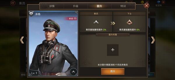 乘员晋升:乘员军衔是提升乘员属性的来源之一,晋升需要消耗同品质乘员,晋升可激活乘员额外附加属性。普通乘员最高军衔是中士;优秀乘员最高军衔是上士;精英乘员最高军衔是少尉;史诗乘员最高军衔是中尉;传奇乘员最高军衔是上尉。