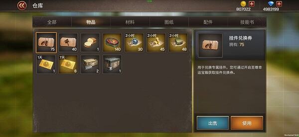 物品:主要用来存放乘员经验道具、战斗奖励加成道具、改名卡道具、活动物品、VIP卡、赛季积分卡、材料箱、配件箱、图纸箱、兑换券。