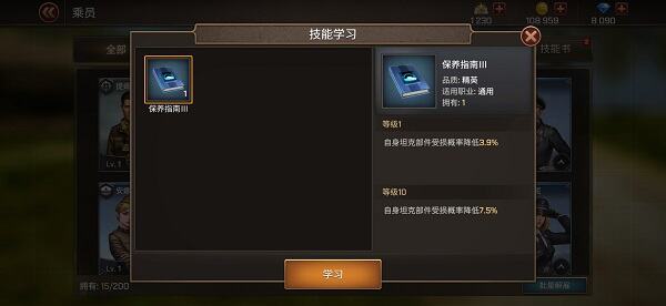 学习技能:技能位解锁之后,通过学习获得乘员技能。技能学习需要消耗对应技能书。