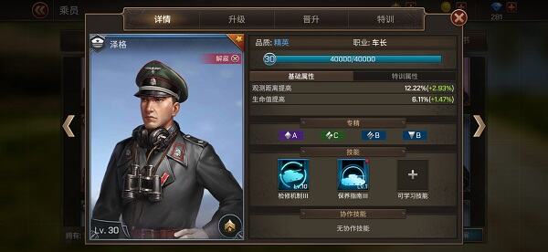乘员系统中,每个乘员在被招募后都有一个天赋技能,还可以通过学习技能来获得新的乘员技能。乘员技能可以在战场上根据特定条件触发,提升坦克的各项属性和战斗性能。在战斗中,乘员技能的运用往往具有逆天改命的作用。熟练掌握、配置乘员技能,是每一个高端玩家必备的一个操作技巧。