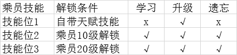 技能位解锁:乘员等级达到10级自动解锁第2个技能位;达到20级解锁第3个技能位,通过消耗同品质乘员激活第3个技能位。