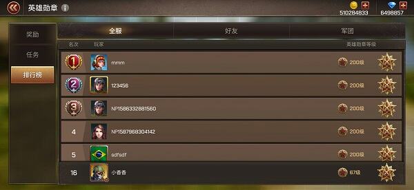 在英雄勋章排行榜界面,可以查看游戏内英雄勋章等级全服排名前100位的玩家,还可以查看自己好友和军团成员的英雄勋章等级排行。