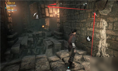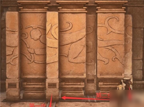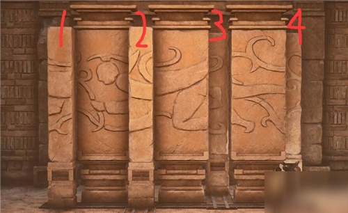往前走遇到拼图谜题。从左到右共四个可移动的柱子,分别标记为1、2、3、4号柱子。
