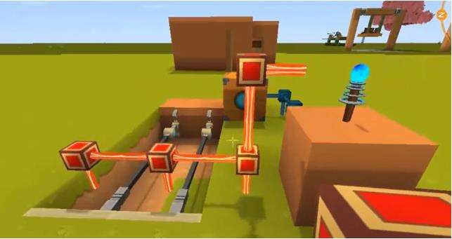 蓝色电能线连接完后,接下来就是红色电能线的连接。拿出红色电能线,并在两个机械臂上分别放置一个,然后在硬沙块上方安装一个电能产生器,最后用红色电能线将机械臂上的电能线与电能产生器连接起来,房子的电路陷阱部分就完成了。