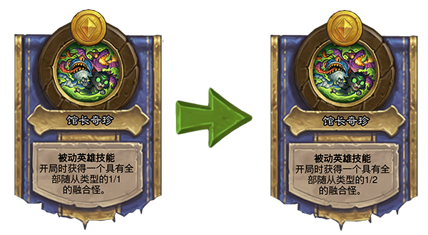 旧:开局时获得一个具有全部随从类型的1/1的融合怪。→新:开局时获得一个具有全部随从类型的1/2的融合怪。
