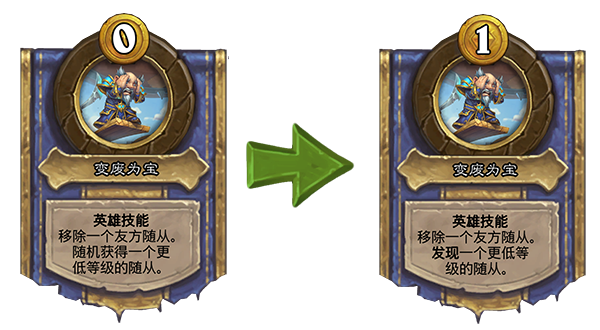 旧:[消耗0枚铸币]移除一个友方随从。随机获得一个更低等级的随从。→新:[消耗1枚铸币]移除一个友方随从。随机发现一个更低等级的随从。
