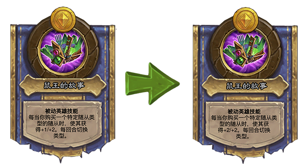 旧:每当你购买一个特定随从类型的随从时,使其获得+1/+2。每回合切换类型。→新:每当你购买一个特定随从类型的随从时,使其获得+2/+2。每回合切换类型。