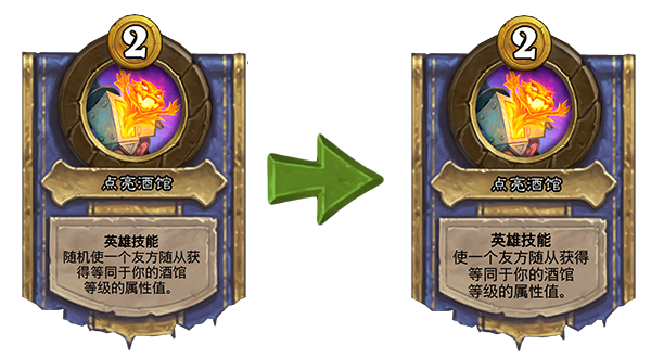 旧:随机使一个友方随从获得等同于你的酒馆等级的属性值。→新:使一个友方随从获得等同于你的酒馆等级的属性值。