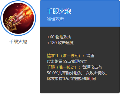 1.千眼火炮的被动效果是“千眼”,在强化普攻有50%的概率触发两次伤害和一个技能的印记(只针对选定的目标)。有了这个装备,飞廉可以2轮1技能(3-4次强化普攻),短时间内造成大量爆炸伤害。