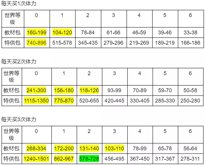 黄底指收益较大,绿底指购买收益基本与购买体力持平