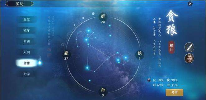 贪狼相照之人,以天下为妄,行狂邪之事,所求者,天下之权也。从这句话就可以得出贪婪受群,魔两属性影响。贪狼星运对悬眼职业就加成效果并且贪狼相照之人可为叶知秋逆天改命。