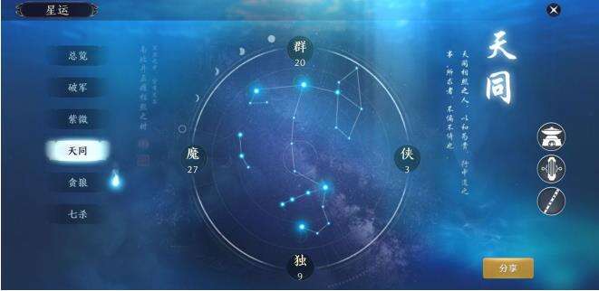 天同相照之人,以和为贵,行中道之事,所求者,不偏不倚也。从这句话就可以得出天同需要各四种属性相互平衡。天同星运对乐伶,文士,厨师职业就加成效果。