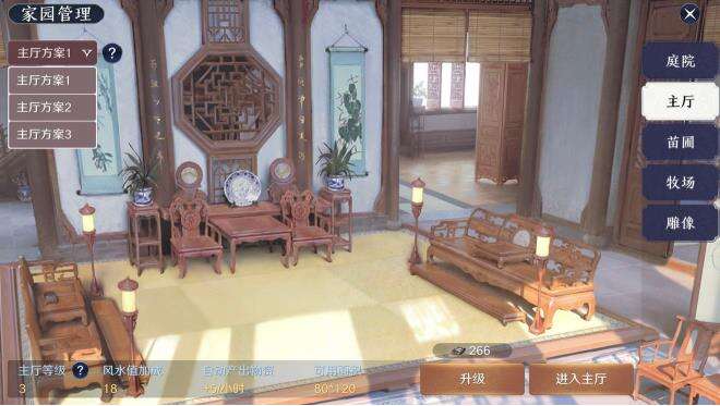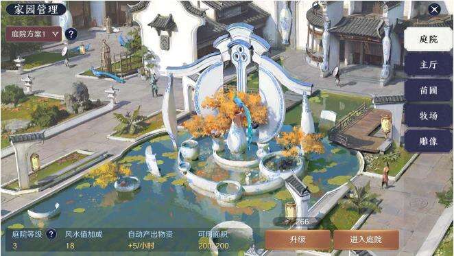 在家园可同时保存多套摆放方案,在家园管理中可进行切换。目前可保存三个方案,不知道后续会不会增加更多的位置。提示:家园组件心剑雕像不会记录在摆放方案中。如切换方案,记得重新摆放哦!我们可以在家园管理页面对庭院进行升级。