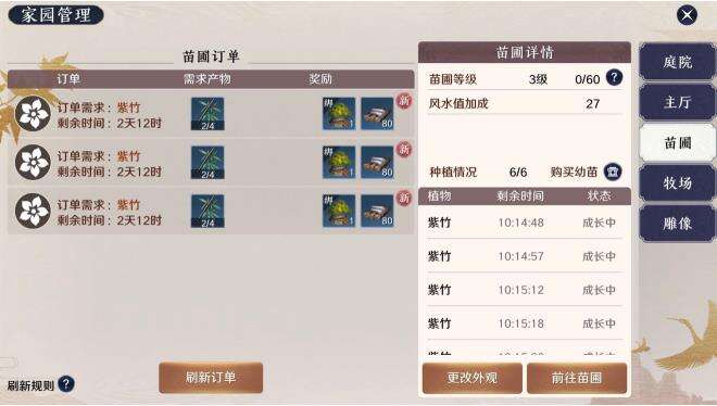 打开后我们可以看到现在的苗圃订单,根据订单种植所需求的产物,获得相对应的奖励。苗圃刷新规则为:订单每日最多可刷新三次,每次刷新将重置订单剩余时间。可能刷新订单所需道具,但奖励不会刷新。在此处我们还可查阅苗圃详情,以及目前苗圃的种植情况。