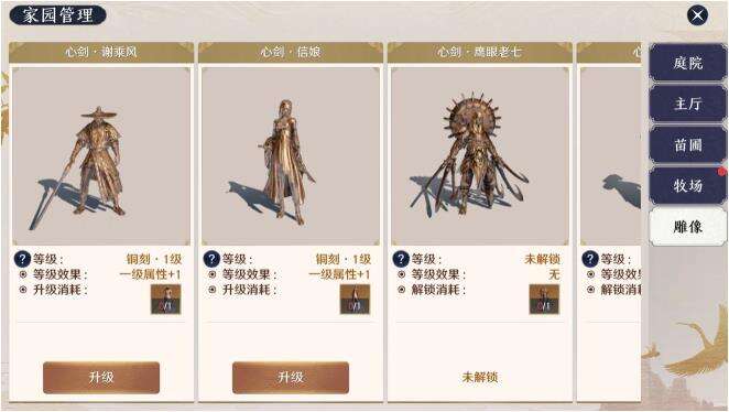 在此我们可以查看目前所拥有的雕像的等级,以及升级所需要的消耗。目前雕像的获取途径就是打本后roll点,将雕像摆放在家园后可获得属性加成,所以少侠们,到时候别忘记了要去打本呀!