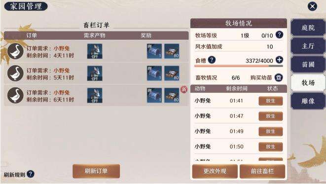 打开后我们可以看到现在的畜栏订单,根据订单养殖所需求的产物,获得相对应的奖励。牧场刷新规则为:刷新可改变订单需求,无法改变订单奖励。刷新消耗随次数。在牧场中还有食槽,每个成长中的小动物,将以一定速度消耗食槽。当食槽为空时,小动物们将停止成长。在此处我们还可查阅牧场详情,以及目前牧场的种植情况。