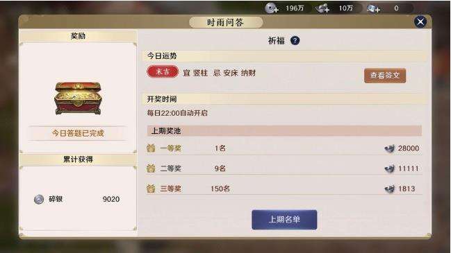 3、答题奖励:碎银、一级修为丹、声望令·天下、时雨签礼盒。