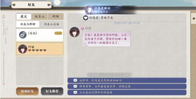 少侠在主线剧情、奇遇、社交、话题中与攻略的侠士进行对话,不同的选项增加的好感度不同。