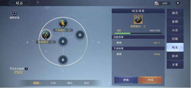 砭石在前期建议选择紫色,升级到九级,等后期获得金色后,再用九级紫色石头升级金色,九级紫色砭石比六级以下的金色砭石增加属性更多,一定要保证能养成六级以上砭石再更换。