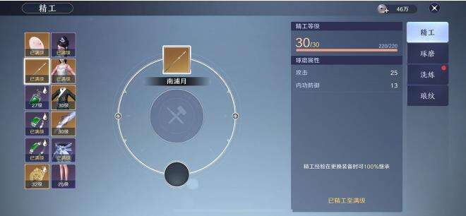 每个装备精工到十级有一个突破,突破后加的功力非常多,所以一定要均衡精工,后期可以优先精工高品质紫装、金装。