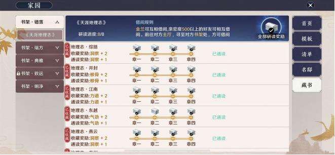 第三个部分是书籍研读,金兰关系或好友度达到500的好友可相互借阅,前往他们的主厅书架处消耗物资加速研读,可以获得研读属性加成,自己购买也可以获得收藏属性。