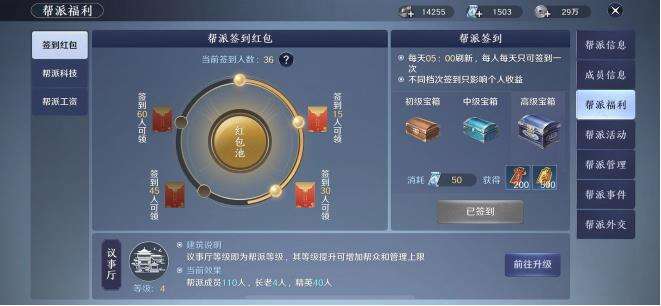 每日必完成的就是:高级签到(获得帮派贡献和海河令)、资金捐献(获得帮派贡献)、帮派委任(获得帮派贡献、海河令、声望、帮派委任礼)。建议帮派委任在每天12:00-13:00期间完成,会有三倍名望获取速率。