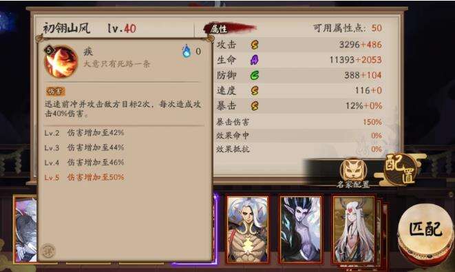 先说基础面板,攻击S,生命A,防御C,速度S,暴击S,攻击数值高达3296非常的高,平砍很给力,生命和防御比较一般,不过够用了,速度非常的快,116就比镰鼬慢1点,而暴击也是高达12%,这让山风的养成成本大幅度降低。