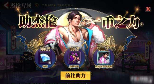 助杰伦一币之力:分享指定页面助力,助力达到指定数值可以获得钻石、S格斗家杰霸碎片、杰伦主界面形象;分享助力到领取杰霸碎片即可