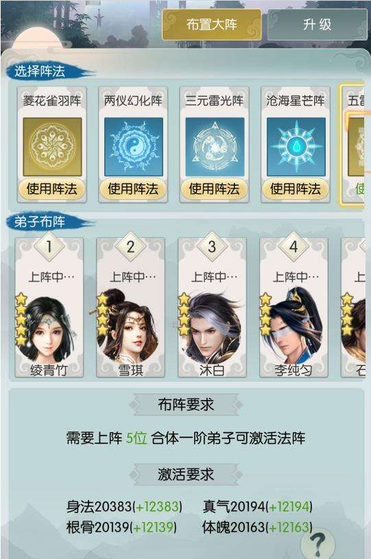 阵法问题介绍:修仙营地最好的属性应该是血影,目前还没有,其次是凌青竹和唐叁,然后是四星雪琪和李纯均最后是石天浩、白木、滕青山等。暂且不谈天赋,有五星弟子的就上五星的弟子。技能加成高。所以要配合洗髓,尽可能提高弟子的四维属性。