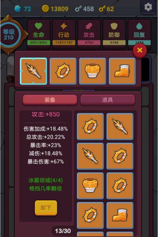 这里有一个比较重要的点,装备属性推荐,格挡是第一优先,最好有一件或多件装备配备吸血,因为格挡也需要减血。吸血后可以一次打三四个怪物,不用等血量回复。有时候,200血开始,最后吸血满了,怪都死了。其他属性随机。此外,格挡只有盔甲和鞋子。