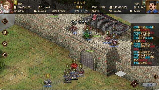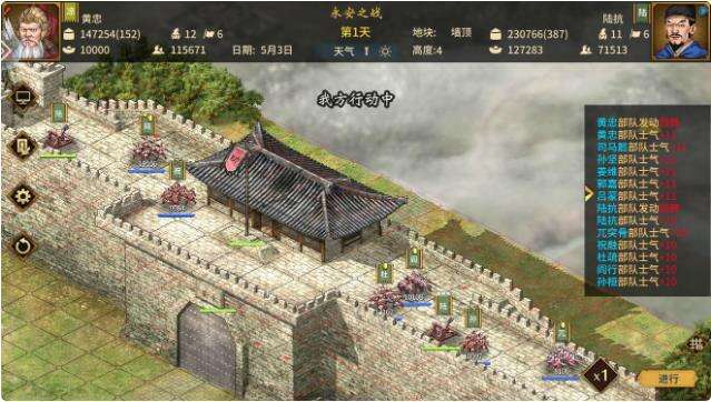 教科书式的攻城,去城防临界点放一辆霹雳车,然后人往前走,吕蒙架,吸引敌人前来阻拦,然后你就会发现不是主将来。显然这是一个错误的演示。然而,主将在城头的一边,所以直接给黄忠一个红buff放大招。钱一路上没动,打一个就打下一个,打三个记得补粮草。