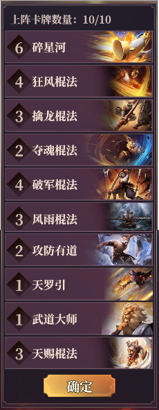 这套卡牌的思路在于通过“武道大师”和“天罗引”过牌,保证首回合拿到核心卡牌“碎星河”打出爆炸输出秒杀敌人。实操过程中,各位大侠如果首回合抽到“碎星河”,则可使用“武道大师”或“天罗引”中的任意一张额外抽牌,加强“碎星河”输出。没有抽到的话,就通过这两张卡牌进行过牌,一般都可以比较轻松的拿到“碎星河”哦。当然实在非酋的话,过完牌都没有拿到“碎星河”,那么“狂风棍法”和“擒龙棍法”在手牌均为棍法流的前提下,输出也是非常可观的哦!