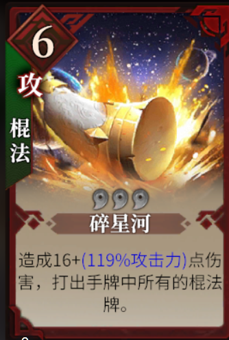 棍法流的核心卡牌即为碎星河,6费消耗造成巨额伤害的同时打出手中所有棍法牌,0氪也能单回合打出2K输出!