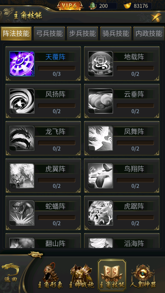 主角技能共有五类,分别是:阵法技能、弓兵技能、步兵技能、骑兵技能和内务技能。