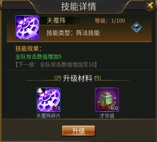 升级技能需要消耗相应的阵片段和天赋值,等级越高需要消耗的材料越多。以天覆阵为例,从0级升级到1级需要2个天覆阵碎片和200个天赋,从1级升级到2级需要3个天覆阵碎片和400个天赋。