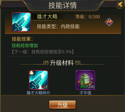 内功提供挂机收入的加成,包括挂机经验,人,铜钱。值得一提的是,所有的阵法技能都需要从这个阵法的阵法碎片升级而来,阵法技能分为四种:甲、圣、神、仙。技能等级越高,提供的加成越多,消耗的升级材料越难获得。比如四书五经跟雄才大略,在1级挂机就有差别了。