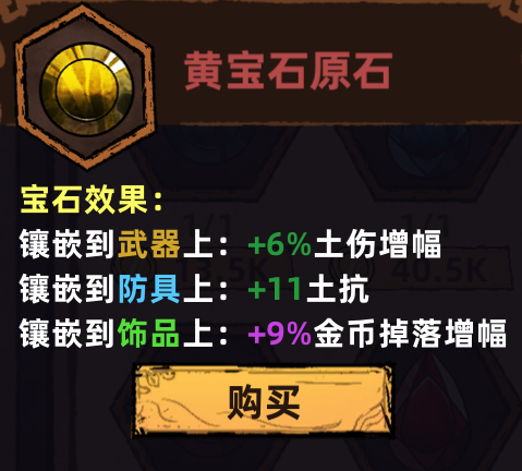 目前游戏中有五种宝石,大部分都是不用的。钻石宝石自带电击还有暴伤,这是对于攻速流玩家来说最需要的。饰品建议全钻石。紫色宝石需要在早期升级,在镶嵌的饰品上用于度过早期阶段。黄宝石建议全部存起来,存到满,因为在游戏后期打圣殿时会非常缺钱,可以用黄宝石来刷钱