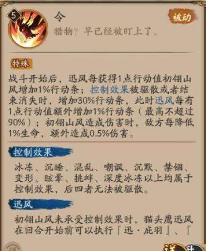 其次则是sp山风技能的施放顺序,在轮到自身回合且在不被控制的状态下,初翎山风可以让猫头鹰迅风执行三个技能的其中一个,【迅·羽庇】可以给友方单位施加一个无法被驱散的护盾,持续两回合,【迅·猎目】紧盯一个敌方目标,降低目标攻击、防御和速度,持续两回合,【迅·击空】可以击飞目标单位,令其御魂和被动都失效,落地时会造成伤害。