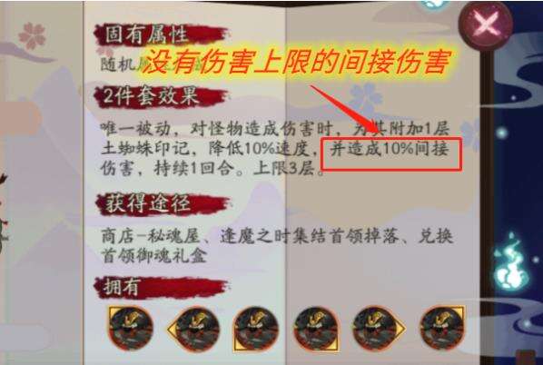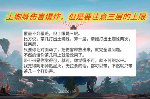 但是土蜘蛛虽好却也有一个缺点,那就是同一队伍中不能有两只式神都带土蜘蛛除非你这两只式神都是输出式神,否则的话后者会覆盖前者因为土蜘蛛的上限只有三层,而若是清姬这样主减防的式神覆盖了输出式神的土蜘蛛就打不出伤害了,这也是为什么有些玩家带土蜘蛛却打不出伤害的原因,各位小伙伴们你们知道了吗?