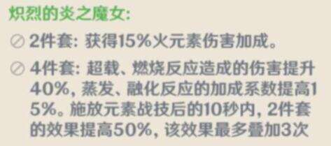 由于可莉所有属性都是火元素伤害,魔女套装可以带来全方位的输出提升,同时4件套的第二效果:释放元素战技后提升2件套的效果,等同我们在10秒内,可以获得30%的火元素伤害,这个还是在不计算火系元素反应混伤加成的情况下!