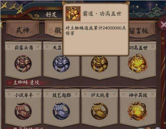 土蜘蛛的印记分为两种,一个是霸道·功高盖世,这个印记的要求是累积对土蜘蛛造成两千四百万伤害,这个要求是比较容易达成的,从现在常用阵容造成的伤害量来看,2-3次就可以拿到这个印记了。