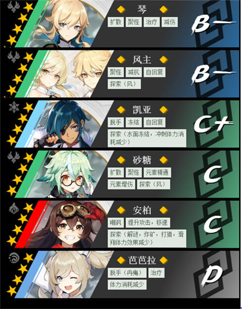 T3强度:琴、风主、凯亚、砂糖、安柏、芭芭拉