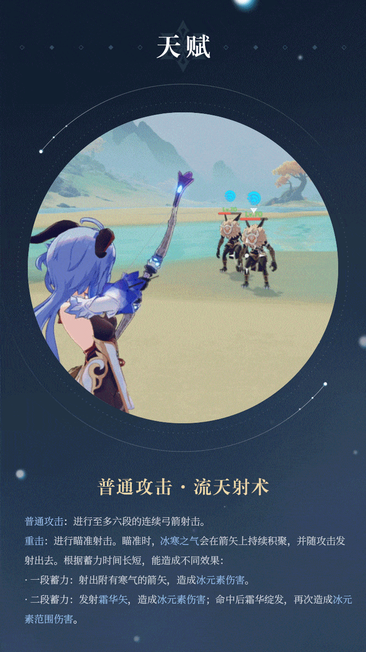二段蓄力:发射霜华矢,造成冰元素伤害;命中后霜华绽发,再次造成冰元素范围伤害