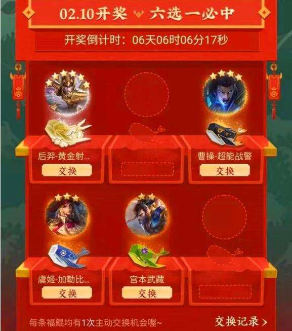 这个活动通过完成活动任务活动“钓鲲”次数(每天最多四次),解锁英雄和皮肤卡片,卡片从1星到6星不等,5星是史诗皮肤,6星是传说皮肤。只要解锁了6张卡片,在2月10日开奖后,可以随机从这6张卡片中获取一张。