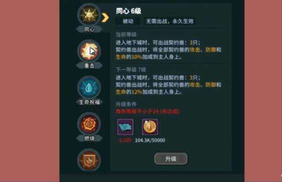 二.技能升级推荐。前期最好是升级“同心”这个被动技能,它可以将大家契约兽的属性的一部分继承到角色身上,包括攻击力,血量这些基础属性,同心的等级高了之后,大家的属性就会越强,刷图就会越容易。主动技能方面,可以升级重击,增加伤害,剩下两个前期作用不太大,不用多点。