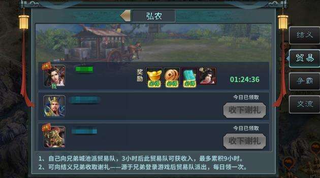1)贸易可以让结义兄弟之间,每3小时产生一次贸易收益,获取元宝等道具;