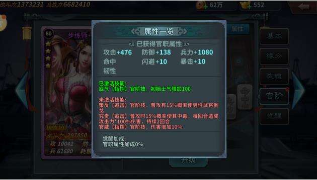 4)官阶。51级解锁,消耗武将“将魂”可提升官阶,解锁新的官阶属性与技能效果。